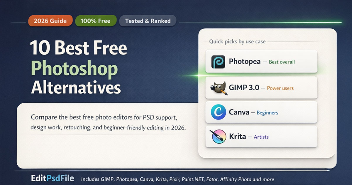 Instead of ranking only by features, we ranked by real-world usefulness. Our research shows most users searching for a free Photoshop alternative care about three things first: PSD support, ease of use, and whether the free version is actually usable long-term.