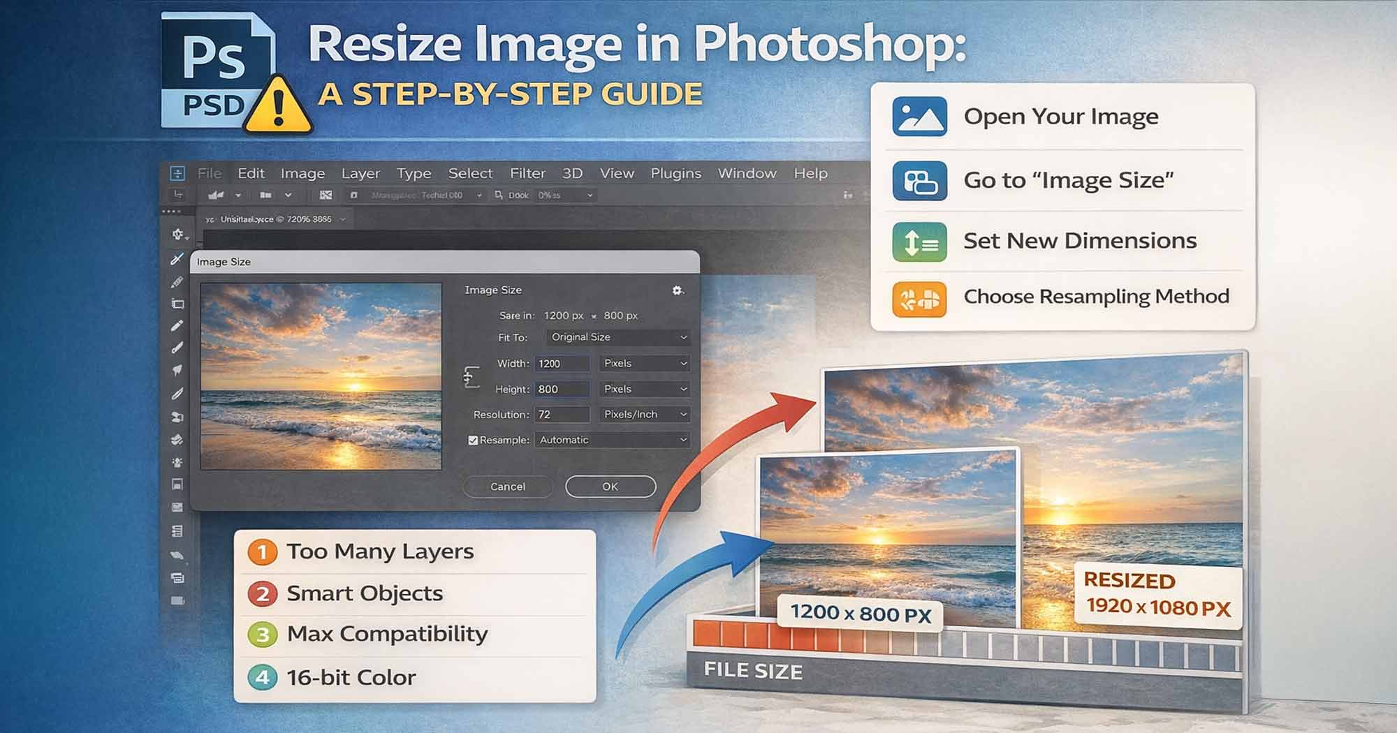 Resizing in Photoshop without losing quality comes down to three decisions: which method to use, which resampling algorithm to apply, and whether you protect your original with a Smart Object.